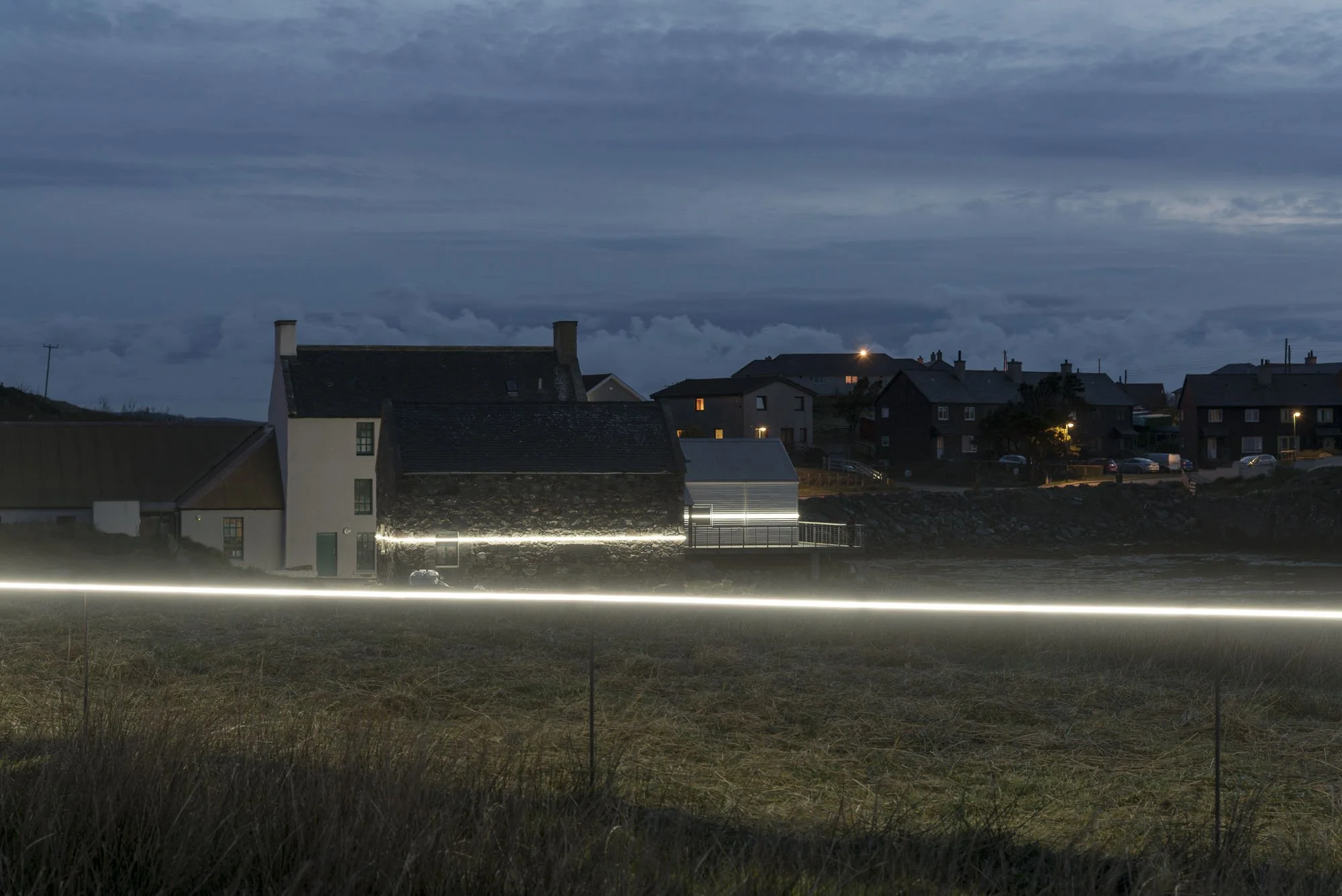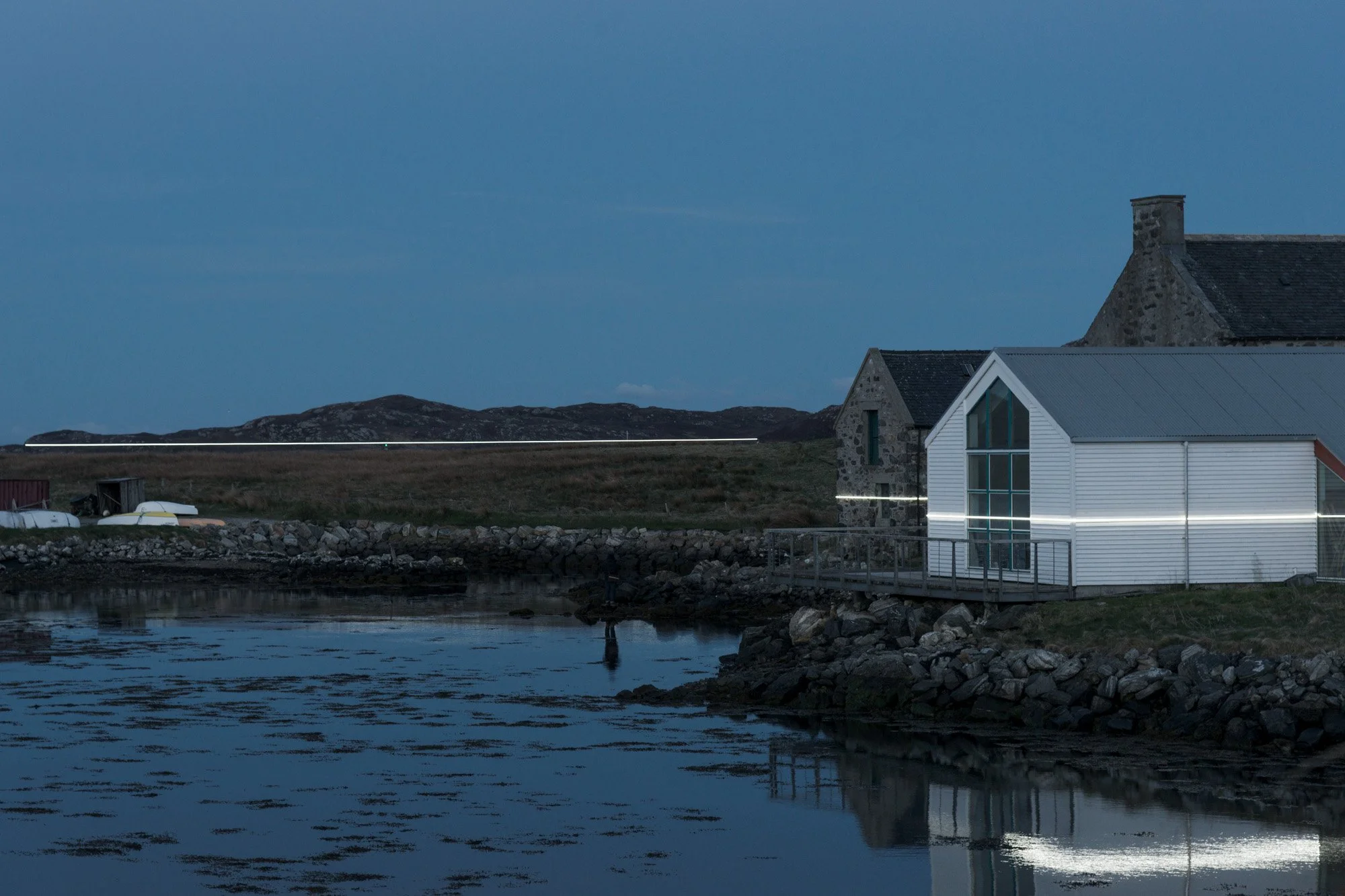 The sea in Outer Hebrides, Scotland, appears calm, growing plant life in still waters. Dark coloration of rocks along the shoreline mark the current highest tides. This light installation provides a striking visual representation of how high the waterline could get. Located at the Taigh Chearsabhagh Museum & Arts Centre, these lights activate at high tide, demonstrating rising storm surge sea levels. The artist's imagination of future consequences is presented here in a tangible form. Viewers can quickly understand that if allowed to raise to this extent, the low-lying island archipelago will face extensive losses of land and culture. Label by Lucas Theobald